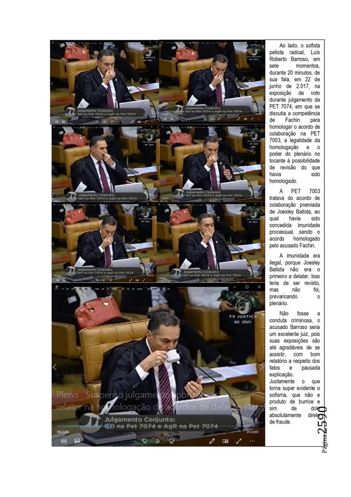 Na imagem do alto da página temos a página 2590 da nossa denúncia de crime de responsabilidade, com o sofista petista corrupto e dementado Barroso falando mentiras deslavadas no julgamento da PET 7074 no STF (delação de Joesley). O sofista petista corrupto dementado não consegue nem se controlar enquanto mente. Fica com cacoetes como levar a mão à boca no momento exato de cada mentira. Na imagem acima flagramos 7 vezes em que o dementado mentiu em 20 minutos de sua exposição na PET 7074 em 22 de junho de 2017. Ao longo da exposição são dissecadas cada uma das mentiras, os sofismas. É um doente mental grave, o que não muda seu abjeto caráter de marginal.